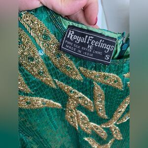This fabulous piece from Royal Feelings is truly one of a kind! It features gorgeous iridescent green palettes and golden-colored beads that create the shape of cascading leaves. In excellent condition. It is 100% made of silk & the lining is 100% made of Rayon. It also has light shoulder padding. Size is marked as small, but as usual refer to measurements for most accuracy. I’m small to medium and it fits me just fine!