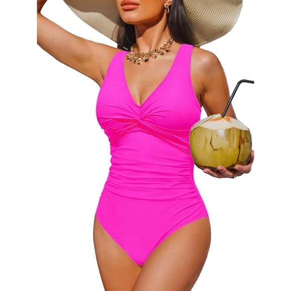 One Piece Swimsuit for Women: This one piece bathing suit combines a stylish V-neckline with a chic twist front detail that elongates the neck and adds a touch of elegance. The low back design elongate the torso and provide a hint of sexy allure.
