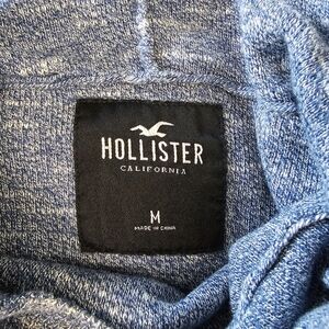 Stay cozy and stylish with this blue/gray Holister pullover knit hoodie with hood pull strings and curved hemline.