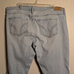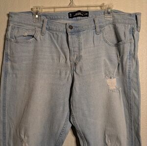 Stylish light blue jeans with distressed details. Perfect for a casual look.