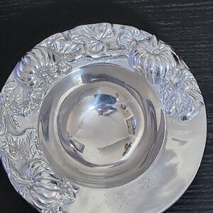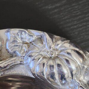 Vintage 8 inch round Polished Pewter Holland Boone Bowl that features three large pumpkins and a high relief design surrounded by vines and leaves. A perfect bowl for fall entertaining or anytime. Excellent condition. Has the Holland Boone sticker on the bottom. 8 inches wide, 2 inches tall Non smoking pet free home. ERC#4