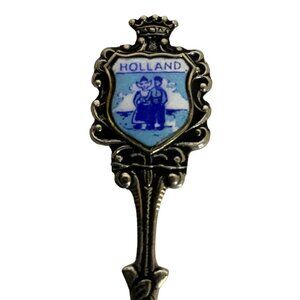A vintage souvenir spoon featuring an ornate silvertone handle, enamel crest with Holland design, and a polished finish. Ideal for collection or display.