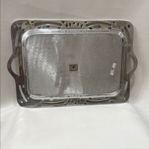 Chic silver tray with elegant cut-out details. Ideal for serving or decor.