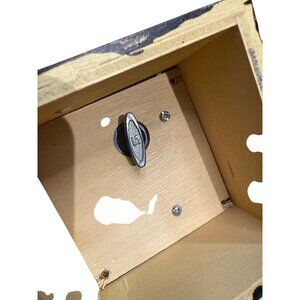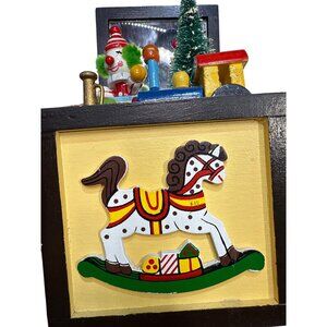 Charming vintage wooden music box featuring a festive dancing clown scene with a Christmas tree and train. Perfect for holiday decor or as a nostalgic gift.