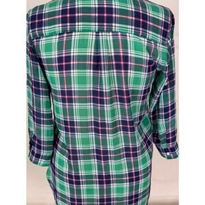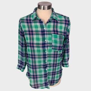 This Hollister 3/4 sleeve shirt is in excellent, like-new condition, free of any stains, tears, or flaws. The plaid pattern features a lovely blend of green and blue, perfect for adding a pop of color to your wardrobe. The button-front design adds a touch of classic style, making it versatile for various occasions.