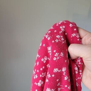 - appears red in photos, but is actually a deep, bold pink with white floral print. best shown in last photo