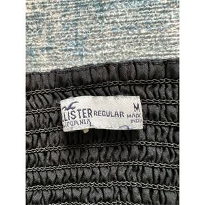 Black 2 tiered mini dress from Hollister. Textured fabric, lace trim, adjustable shoulder straps, and smocked back. Fully lined.
