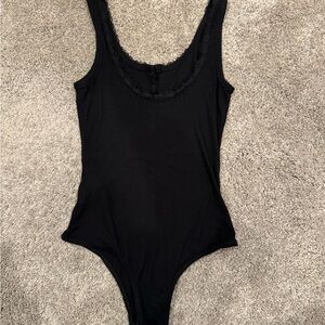 Hollister Black Tank Bodysuit with buttons on front & lace edge, snap closure at the crotch, women’s size S, excellent preloved condition. Stretchy comfy material.