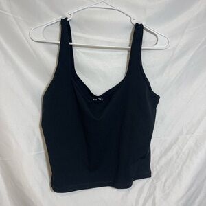Sleek black ribbed tank top. Sleeveless design. Perfect for layering.