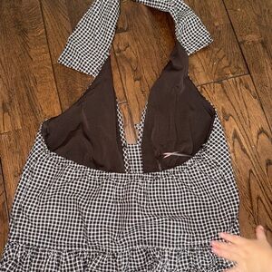 Stylish checkered blouse. Features halter neck and button front. Ruffled hem adds flair.