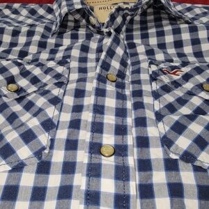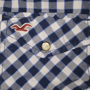 This Hollister shirt features a classic blue gingham pattern, stylish pearl snaps that is perfect for a laid-back yet stylish look. Crafted for comfort, it is an ideal choice for casual outings. The shirt's timeless design ensures it remains a staple in your wardrobe.