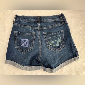 These Hollister jean shorts feature a classic blue hue with a trendy distressed finish, perfect for a casual, laid-back style. The high-waisted design and cuffed hem add a touch of modern flair, making them a versatile addition to any wardrobe. Enjoy the playful, customized look with subtle decorative elements that set these shorts apart.