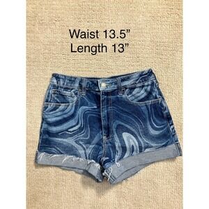 Stylish blue jean shorts. Features a unique swirl pattern. Rolled hem design. Perfect for casual wear.