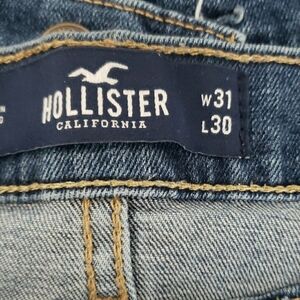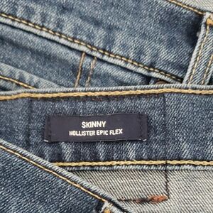Experience the perfect blend of comfort and fashion with Hollister's blue skinny jeans. These jeans feature a classic denim style with a medium to light blue wash, offering a versatile look for any casual occasion. The subtle fading patterns add a touch of worn-in charm, making them a staple in any wardrobe.