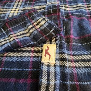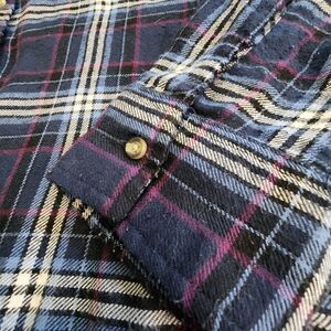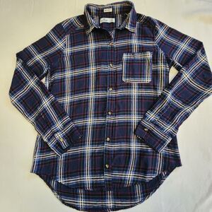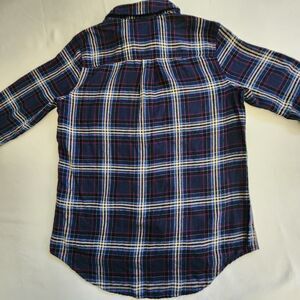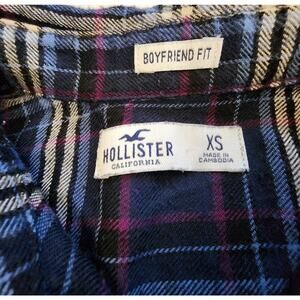 This Hollister button-down shirt is a classic Y2K-inspired piece in a size XS. Made of cotton flannel fabric, it features a multicolor plaid pattern with a collared neckline and long sleeves. The boyfriend fit offers a relaxed and comfortable style, suitable for all seasons. Easy to care for with machine washable instructions, this preppy top includes button accents and pockets, perfect for a timeless and versatile addition to any wardrobe.