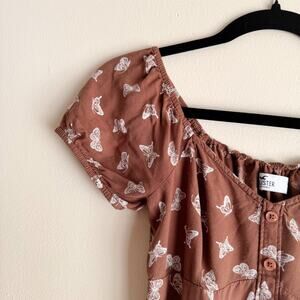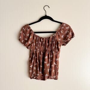 Charming brown blouse with butterfly print. Short sleeves. Square neckline.
