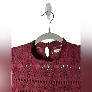 Keywords: Hollister lace dress, burgundy cocktail dress, sleeveless party dress, wine red mini dress, mock neck lace overlay, special occasion dress, junior size 0, fall wedding guest outfit.