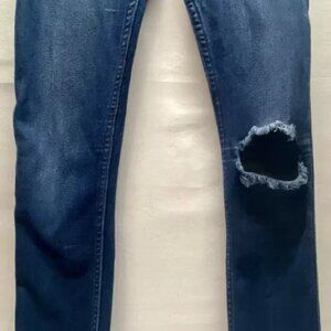 These ladies distressed knee jeans are in good pre-owned condition with no holes or stains and minimal signs of wear. Please see all photos as this is the exact garment you will receive. Standard 5 pocket design, machine wash cold. Hole is on left knee. Measurements taken with item laying flat- waist is 13", length from high point of waist to bottom hem is 35", inseam is 28"