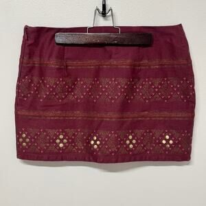 Hollister California mini skirt in burgundy with gold geometric print and stud details. Size 9. Cute boho festival vibe, perfect with boots or a crop top. Gently worn, great condition.