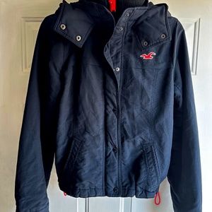 HOLLISTER all weather Winter Navy Blue Jacket/Coat. Size Large Condition: Excellent. Super Cute! Very Warm! Logo, Zipper and Draw string are PINK color. Fleece Lined, Zipper and Snaps work perfectly. Macine Washable in cold water and tumble Dry on low.