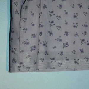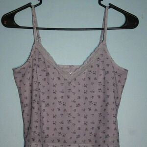 This sized medium lilac purple mini floral print camisole with adjustable straps is perfect on its own or under a sweater in any season. It is so soft made with 96% Polyester and 4% Elastane and lined with 100% polyester layer. The lace on the neckline is a nice finishing touch.