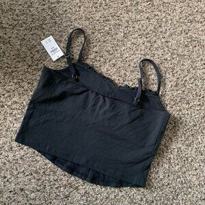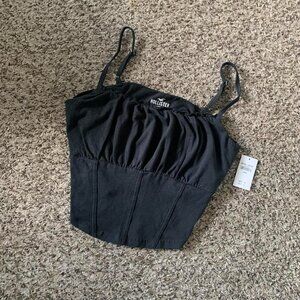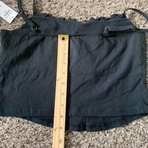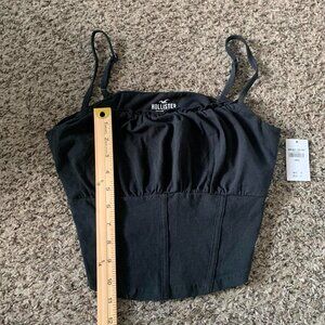 black, corset style, crop top, spaghetti straps, ruched, fitted, sleek, feminine, partywear, summer style