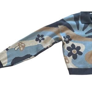 Hollister Cotton Blend Blue Cropped Cardigan with Mushrooms and Flowers, Size Small