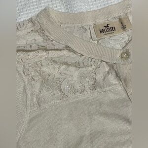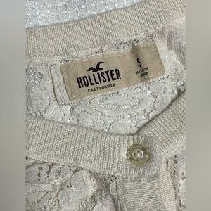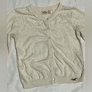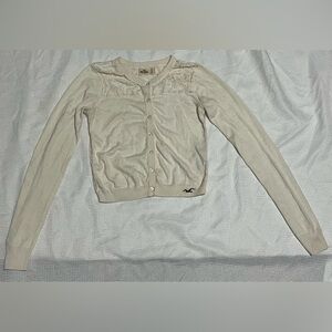 Hollister off white cream cardigan with lace details. Features button-up front. Long sleeves for a cozy fit. Perfect for layering. Women’s size Small. Preloved.