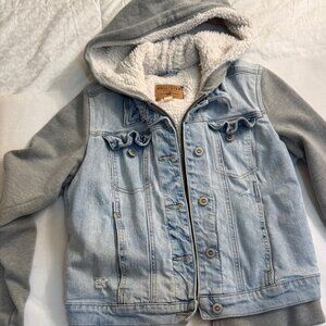 Hollister Denim sheepskin lined jacket with gray sweatshirt sleeves and hood.