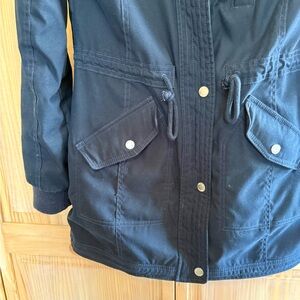 Navy parka with a luxurious faux fur hood. Ideal for cold weather. Heritage collection, stretch. Very soft and warm. 31 inches long