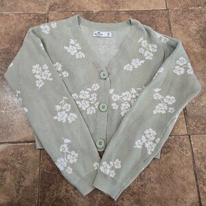 Adorable sage green button-up cardigan with soft white floral print from Hollister, size XS. Comfy and versatile for layering over dresses, tanks, or basics.