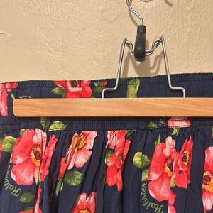 Vibrant floral mini skirt. Features bold red flowers on a navy background. Ideal for casual outings.