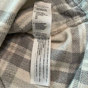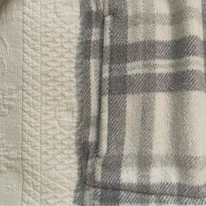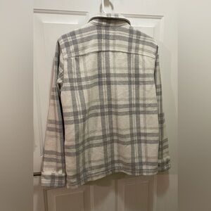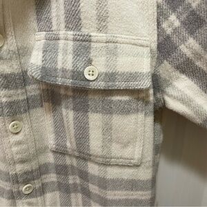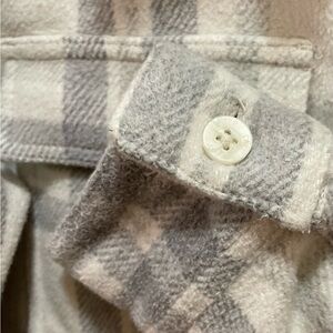 Stylish wool blend jacket with a plaid pattern. Features button-up front and chest pockets and side pockets. Perfect for layering.