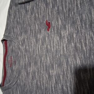 Stylish gray shirt with red accents. Features Hollister logo. Comfortable and casual.