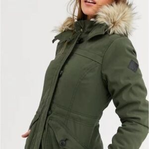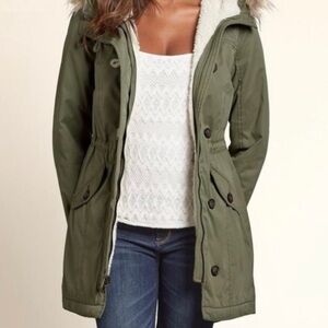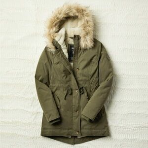 New without tags! Hollister Heritage Collection Green Military Parka. Size XS, but could also fit a small. Attached faux fur trimmed hood with incredibly soft faux fur lining throughout the hood and jacket. Very warm. Has a zip and button closure front and drawstring adjustable waist tie. For length reference, I’m 5.5” and it hits below the crotch area in the front and slightly longer in the back, so it covers the booty! It’s literally the softest warmest thing ever.