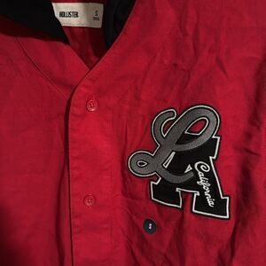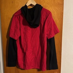 This is new without tags. Please note the small size sticker is still intact. The paper tag was removed to prevent retail returns. The color is red and black. The logo is stitched on. The sleeves are like a sweatshirt material. The fabric content is 70 % cotton, 30 % polyester. The chest is 42 inches, 21 flat. The length is 28 inches. The sleeves are 26 inches.