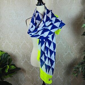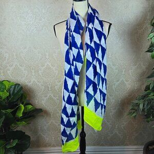 Colorful print scarf has a blue and white triangle pattern and is edged in a bright lime green/yellow. Marked Irregular on the Hollister tag. A great gift for yourself or a loved one.