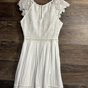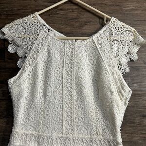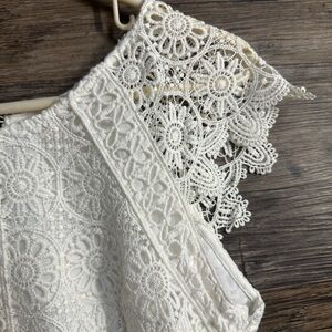 Chic ivory mini dress with crochet lace. Cap sleeves add elegance. Ideal for casual outings.