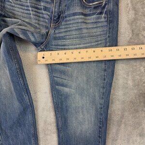 Color: Medium blue wash with distressed fade and whisker patterning on the thighs