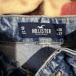 The product is a pair of Hollister Women's 3R Blue Denim Jeans in size 26/27. These ultra high rise jeans feature a mom pocket and raw hem, with a solid pattern and medium wash. Made of a comfortable cotton blend denim fabric, they have a regular fit and are machine washable. Suitable for all seasons, these jeans offer both style and practicality for women looking for a versatile wardrobe staple.
