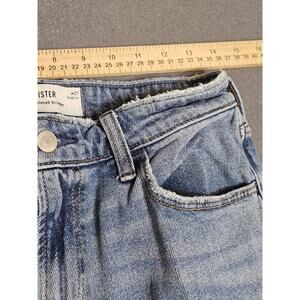 The jeans have a mid-rise waist of 27 inches and a straight fit with a 28-inch inseam. They feature a 5-pocket design with a zip and button closure. The accented buttons, zippers, and Hollister logo add a touch of Bohemian and 90s style to your outfit. These jeans are perfect for any season, whether it's winter, summer, fall, or spring.