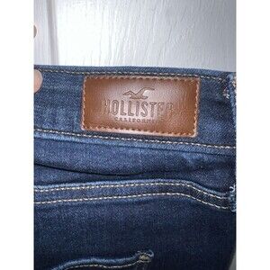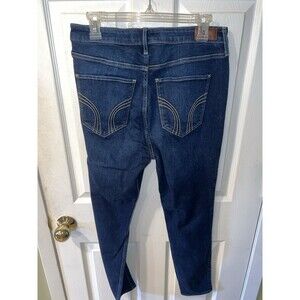 The product is a pair of Hollister women's jeans in size 15 with a high-rise, super skinny fit and stretch fabric. The medium wash denim jeans feature a solid blue color with a zipper and button closure. Made from a cotton blend, these retro-themed jeans are machine washable and have a 28 inch inseam. Perfect for juniors looking for a classic, yet modern and stylish look with a touch of nostalgia.