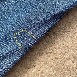 Some slight bubbling in denim material in some areas (see Pics #2-3, 7, 9-11) – Likely will stretch out when wearing & not notice.
