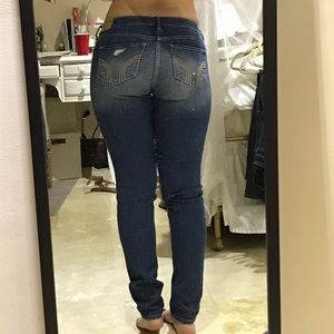 Hollister low rise skinny jeans ripped at the knees. Measurements are 28 inches (waist) and 31 inches (length). The size is 7R which is equivalent to a medium of regular length.