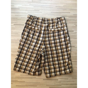 This is a Hollister, Men's Bermuda Shorts. They are in a brown plaid and have a button fly. There is some light distressing on them, not sure if they were made that way or if it is just from wear. You can look in the pictures. It is in good used condition.