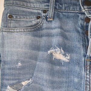 Minor fraying and wear on distressing areas. Waist = 34 inches, inseam = 33 inches.