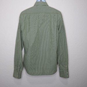 Pre-Owned Condition! 100% Cotton. Handsome Green & White Stripe Long Sleeve Single Chest Pocket Shirt with Matching White LOGO Brand Buttons(spare attached).