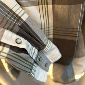 Hollister Men’s Long Sleeve Snap button plaid shirt. 2 pocket western style. Thicker cotton. Gray, white, green and blue plaid.