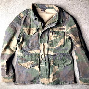 Vintage Hollister Jacket. Military style, camouflage touch cotton fabric, size M, 4 pockets with adjustable drawstrings, zip-out hoodie is cotton blend. Full zip closure and button closure as well. Epaulettes and drawstring around waist to get the perfect fit. Excellent vintage condition.