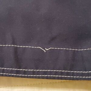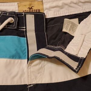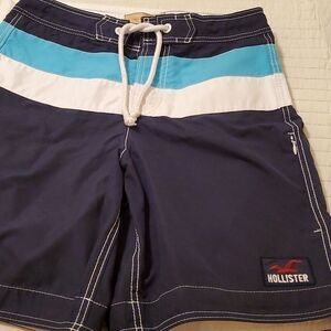 Hollister Navy, aqua & white Swim trunks, rope tie, velcro closure, side zip pocket, size Small. Please Note pic of missing stitch on back of left leg. Very good pre loved condition, measurements in pics, smoke free home.